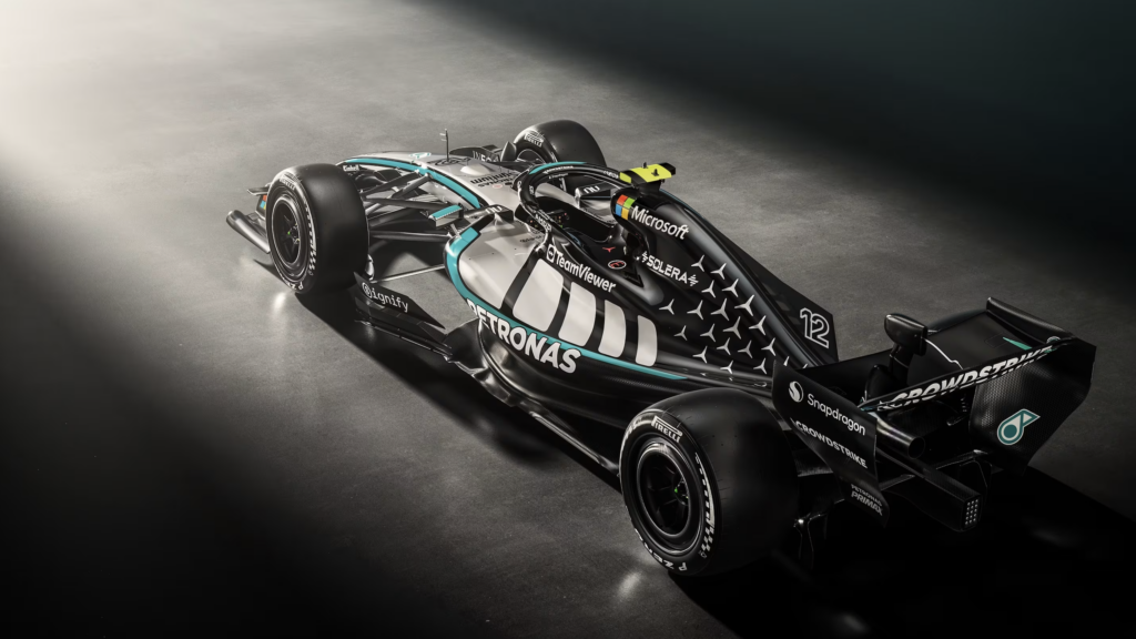 El monoplaza conserva la identidad visual reciente de la escudería, con una base en negro y plata realzada por acentos en verde Petronas, un guiño a la alianza histórica con su socio técnico
