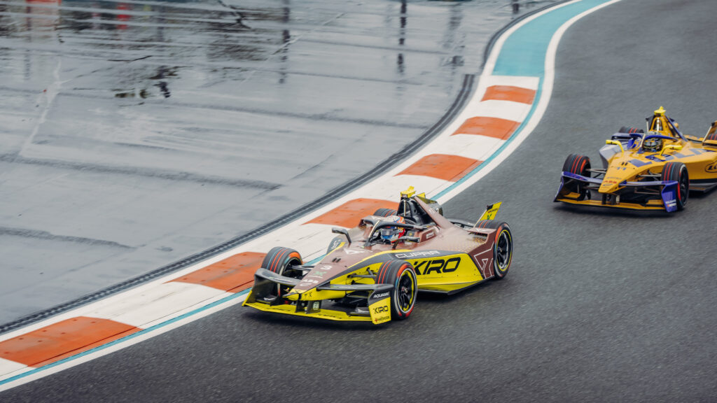 La prueba, disputada en el Autódromo Internacional de Miami, comenzó bajo circunstancias complejas tras una ligera lluvia previa. Las primeras cinco vueltas se realizaron detrás del coche de seguridad —un Porsche Taycan Turbo GT— antes de que se diera la salida desde parado en una carrera pactada a 41 vueltas.